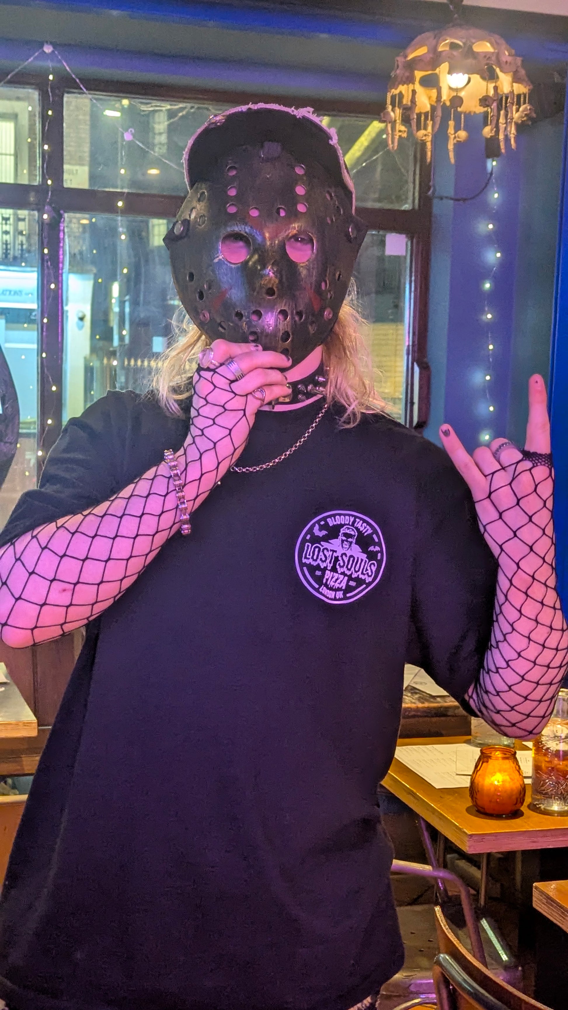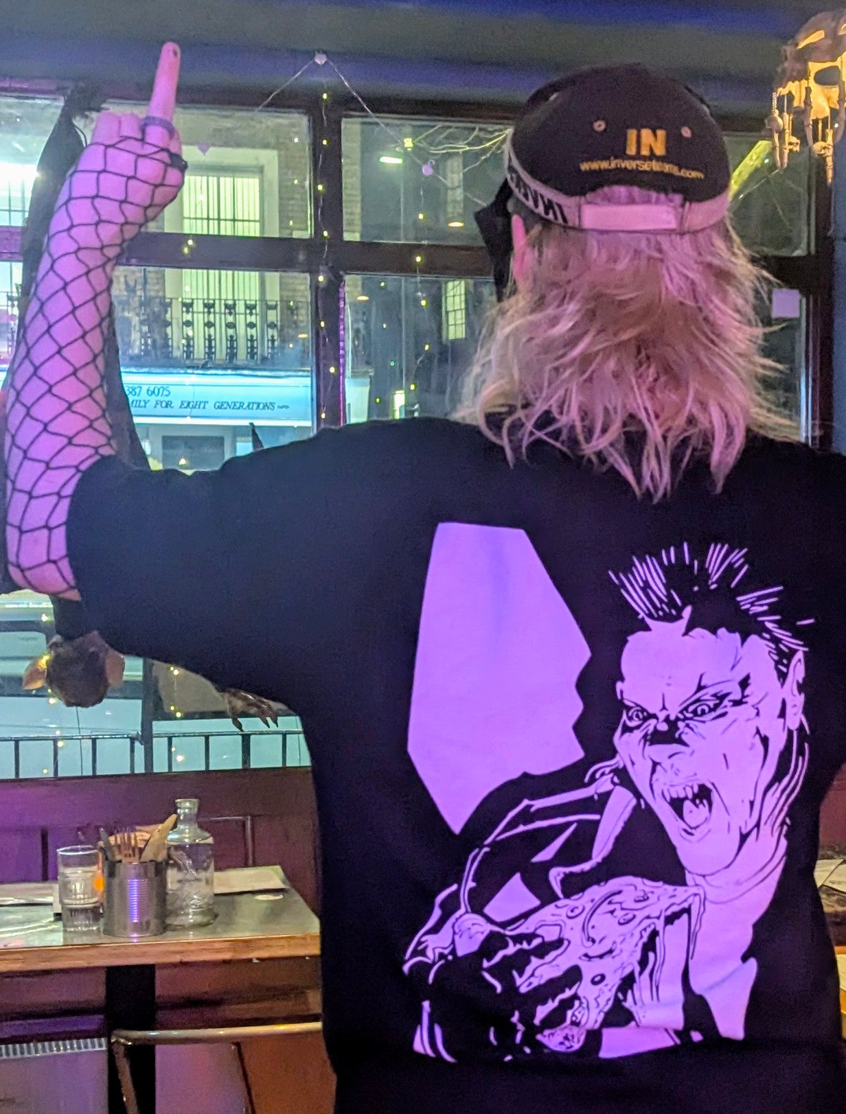 White Classic logo on a shirt as black as our hearts. Vampire munching a slice on the back.