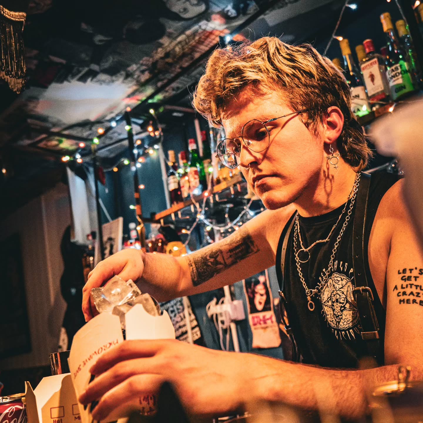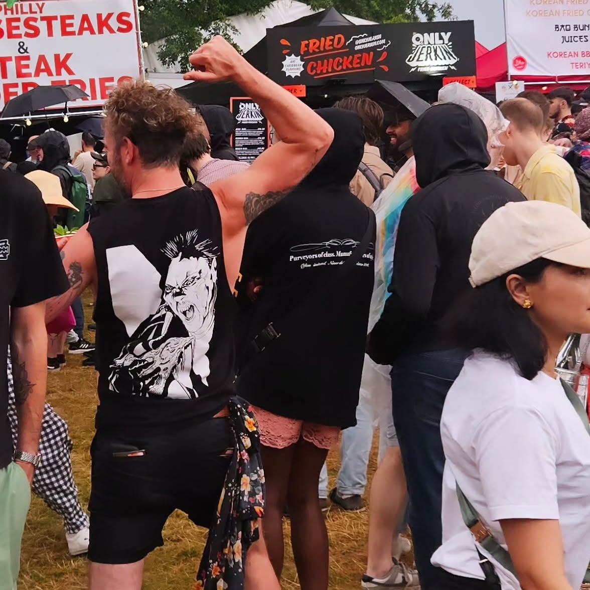 Black as our souls, white three-eyed goat logo on the front. Vamp and a slice on the back.